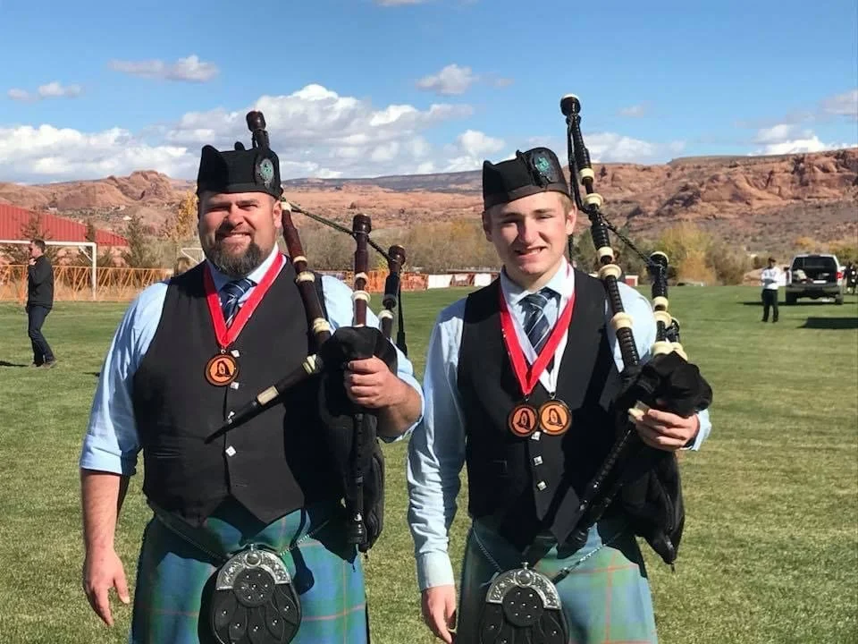 My bagpipe teacher and I showing off our competition medals, Moab, Utah